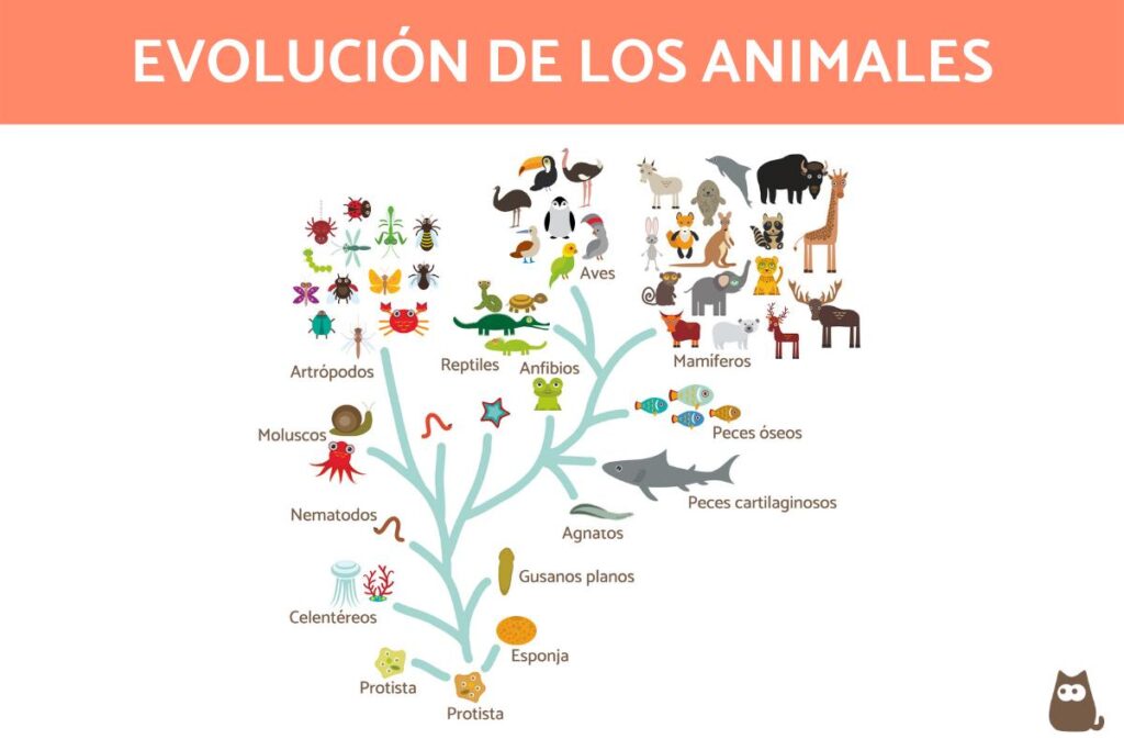 Uno de los momentos más importantes en la evolución animal fue la aparición de los vertebrados, hace unos 500 millones de años. Los vertebrados son animales con columna vertebral, como peces, anfibios, reptiles, aves y mamíferos.